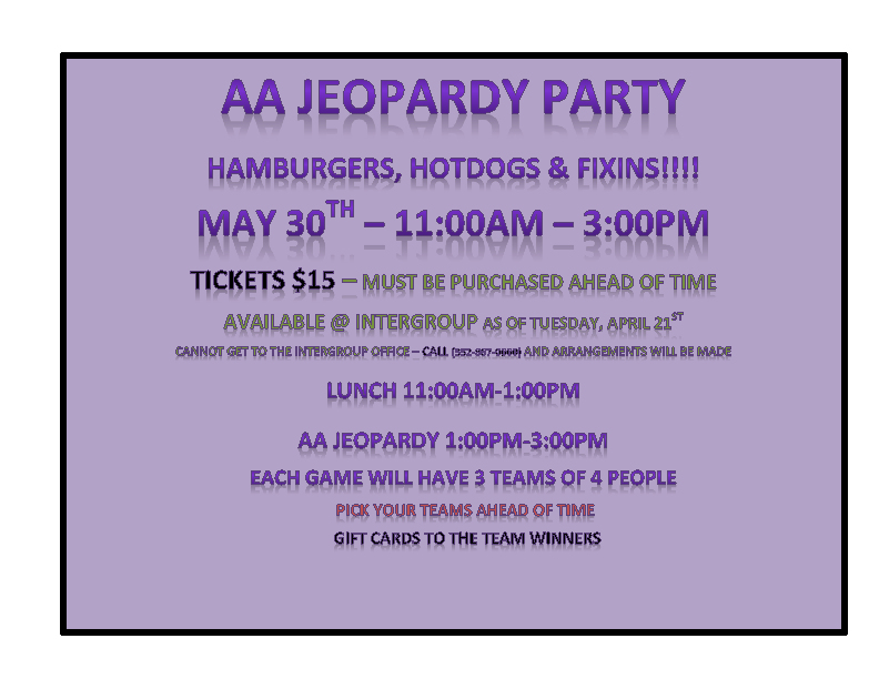 AA Jeopardy Party May 30th 11:00 am till 3:00 pm